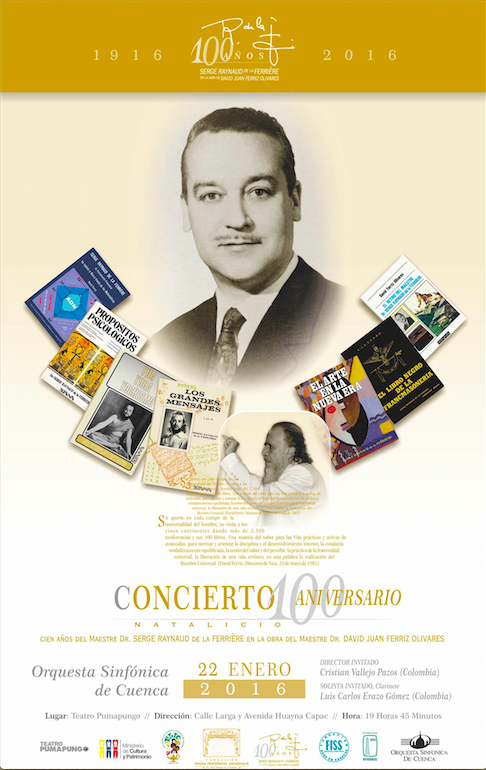 Este viernes 22 de enero en el Teatro Pumapungo, la Orquesta Sinfónica de Cuenca dará el Concierto para la Unidad y la Paz, en Homenaje a los 100 años del nacimiento del Maestre Dr. Serge Raynaud de la Ferriére, Gloria de Francia, será el II Concierto de la I Temporada 2016, que se realizará bajo la batuta del maestro Cristian Vallejo Pazos (Colombia).