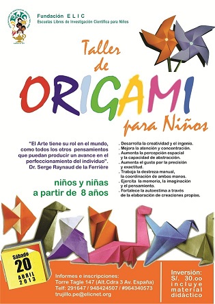 La Fundación ELIC, Escuelas Libres de Investigación Científica para Niños, presenta el Taller de Origami para Niños, que se realizará el sábado 20 de abril a las 3:30 p.m. en Trujillo, Perú.