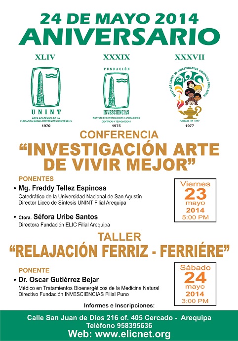 El 24 de mayo del 2014, la Fundación ELIC, Escuelas Libres de Investigación Científica para Niños, celebrará a nivel mundial el 37° aniversario de su creación (1977) con diversas actividades académicas y culturales. En esa línea, la sede de Arequipa (Perú) ha organizado una serie de actividades.